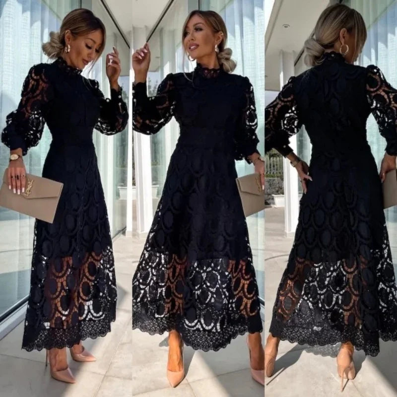 Thea | Long Lace Dress with High Neck and Puff Sleeves